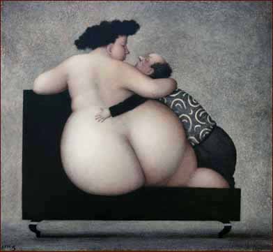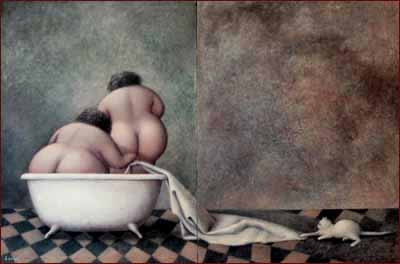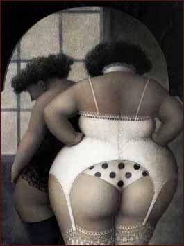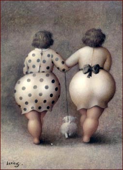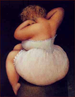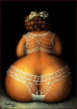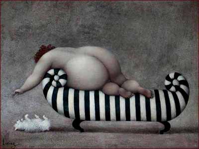 На каждой картине Лориоз живут и радуются жизни пухлые женские жопы. Они кувыркаются на мягких диванчиках, игриво выглядывают из трусиков в горошек, гуляют с собачками, крутятся у зеркала, сплетничают с другими жопками, плещутся в ванной и все время флиртуют со зрителем.